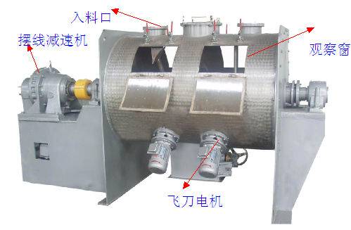 它主要是由傳動(dòng)部分,臥式筒體、犁刀組軸、飛刀組、出料閥、噴液裝置等組成。